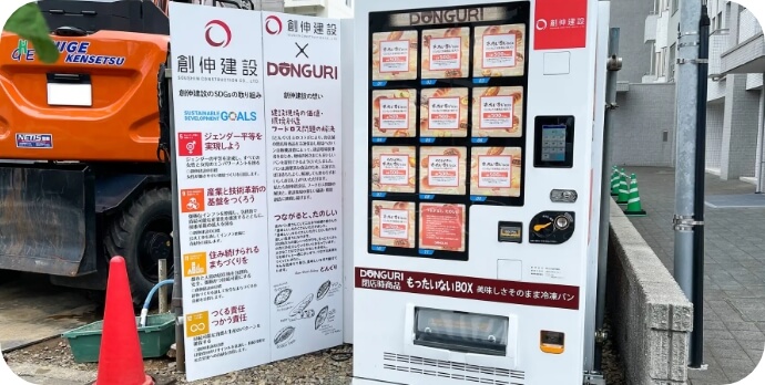 パン屋との異業種コラボで、2022年より建設現場に冷凍パンの自販機を設置する取り組みを実施。3Kイメージの払拭やフードロス削減に貢献しつつ、 地域の人も気軽に立ち寄れる「身近な現場」を目指しています。働く人にとっても楽しく心地よい現場づくりを進めています。